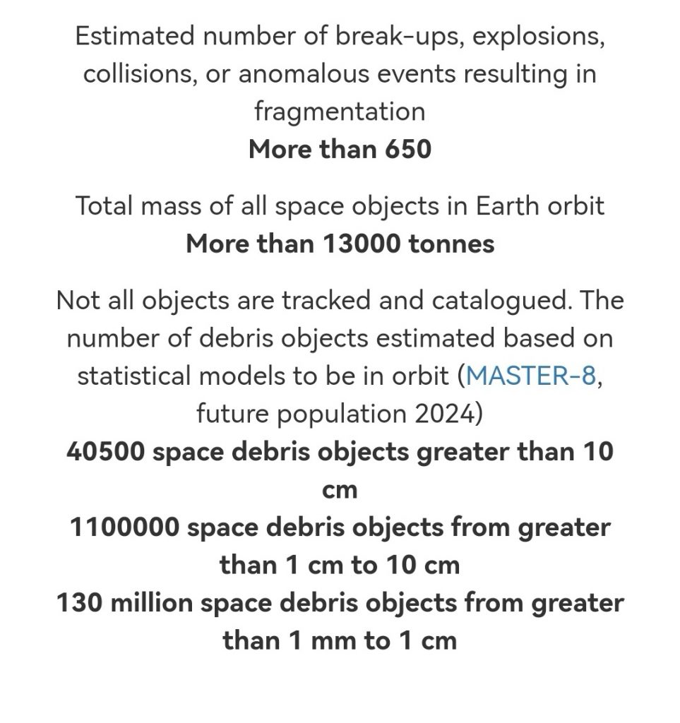 60 yılı aşkın uzay faaliyetlerinde, 6050’den fazla fırlatma yörüngede yaklaşık 56450 izlenen nesneyle sonuçlandı, bunlardan yaklaşık 28160’ı uzayda kaldı ve ABD Uzay Gözetim Ağı tarafından düzenli olarak izleniyor ve düşük Dünya yörüngesinde (LEO) yaklaşık 5-10 cm’den ve jeostasyon (GEO) irtifalarda 30 cm ila 1 m’den büyük nesneleri kapsayan kataloglarında tutuluyor. Günümüzde yalnızca küçük bir kısmı -yaklaşık 4000- sağlam, çalışır durumda uydulardır.