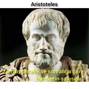 Aritoteles şöyle düşünüyor; Zaman öncelik ve sonralığa göre hareketin sayısıdır. Bunun yanında zaman süreklidir, böyle olmasa öncesi ve sonrası olamaz. Zaman değişimden bağımsız değildir, değişimin olmadığı bir yerde zamandan söz edemeyiz. İnsan değişimin farkında olmadan zamanında farkında olamaz.