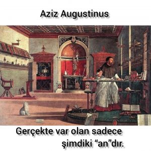 Filozof ve tanrıbilimci Aziz Augustinus dinin etkisinde; Tanrı evreni yoktan yaratmıştır, zamanı da diyor. Ve ekliyor; Geçmiş zaman geçmiş olduğu için, gelecek zaman da henüz gelmediğine göre nasıl vardır diyebiliriz? Nerededir onlar? Her neredeyseler geçmiş ya da gelecekte “şimdiki zaman” olarak vardırlar. Öyleyse gerçekte var olan sadece şimdiki “an”dır. Augustinus “geçmişte”, “gelecekte” oldukları yerde “şimdiki zaman” olarak vardırlar diyor.
