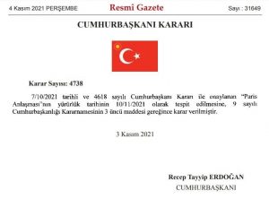 Cumhurbaşkanı ve AKP Genel Başkanı Recep Tayyip Erdoğan tarafından imzalanan kararla, Paris Anlaşması’nın yürürlük tarihi 10 Kasım olarak belirlendi.