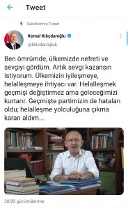 CHP Genel Başkanı Kemal Kılıçdaroğlu, sosyal medya hesabından yaptığı paylaşımla verdiği kararı duyurdu. Kılıçdaroğlu, “Geçmişte partimizin de hataları oldu; helalleşme yolculuğuna çıkma kararı aldım…” açıklamasını yaptı.