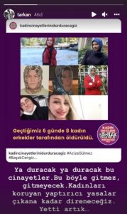 “Ya duracak, ya duracak bu cinayetler. Bu böyle gitmez, gitmeyecek. Kadınları koruyan yaptırıcı yasalar çıkana kadar direneceğiz. Yetti artık…”