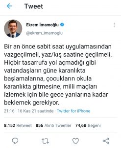 İstanbul Büyükşehir Belediye Başkanı Ekrem İmamoğlu, sosyal medya hesabından sabit saat uygulaması ile ilgili açıklamalarda bulundu.