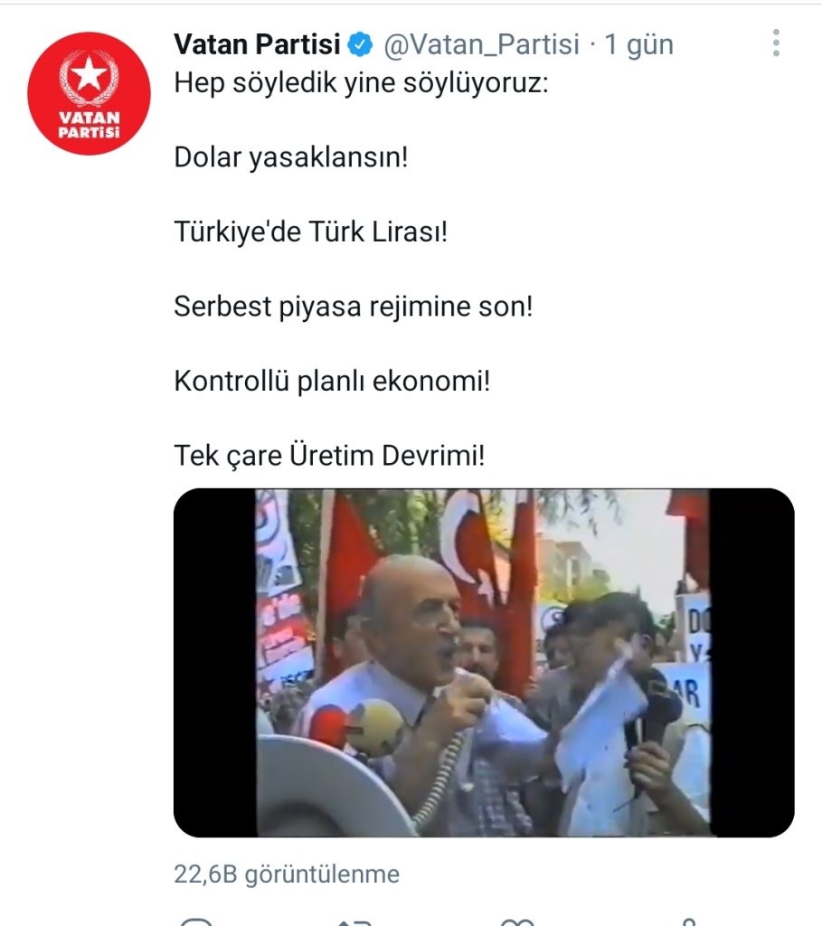 Partinin geçmiş eylemleri ve Doğu Perinçek’e ait görüntülerin de yer aldığı paylaşımda “Hep söyledik yine söylüyoruz: Dolar yasaklansın! Türkiye’de Türk Lirası! Serbest piyasa rejimine son! Kontrollü planlı ekonomi! Tek çare Üretim Devrimi!” dendi.