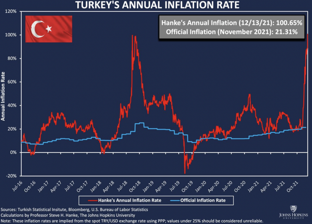 Faiola, yazısında ekonomist Steve Hanke’nin* 13 Aralık günü paylaştığı sosyal medya mesajına yer verdi. Hanke mesajında grafik paylaşarak şöyle yazdı: “Başkan Erdoğan’ın irrasyonel faiz fikri, Lira’yı batırıyor ve enflasyonu yükseltiyor. Bugün tam olarak hesapladım: Erdoğan ve Merkez Bankası’ndaki adamları yüzünden Türkiye’de yıllık enflasyon % 100,65… Türkiye’nin sahte resmi Kasım 2021 yıllık enflasyonunun 5 misli… Sabit kur politikası zamanı…”