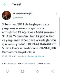 Mosturoğlu, “3 Temmuz 2011 de başlayan, ceza yargılaması süreci bugün sona ermiştir.İst.13.Ağır Ceza Mahkemesinin Sn.Aziz Yıldırım, Sn.İlhan Ekşioğlu, ben ve yargılanan diğer dava arkadaşlarımız için vermiş olduğu BERAAT KARARI Yrg.5.Ceza Dairesi tarafından ONANMIŞTIR. Camiamıza hayırlı olsun” ifadelerini kullandı.