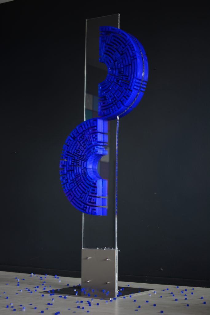 Sanatçı, geleneksel sanatın çağdaş bir yorumcusu olarak zengin ve köklü bir tarihe sahip Türk şiirinin dizelerini ve Kur’an ayetlerini, yeni bir yorum getirdiği kufi yazıyla ve özgün renklerle buluşturdu.