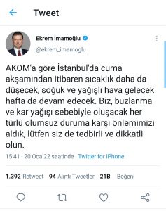 İmamoğlu mesajında “AKOM’a göre İstanbul’da cuma akşamından itibaren sıcaklık daha da düşecek, soğuk ve yağışlı hava gelecek hafta da devam edecek. Biz, buzlanma ve kar yağışı sebebiyle oluşacak her türlü olumsuz duruma karşı önlemimizi aldık, lütfen siz de tedbirli ve dikkatli olun” ifadelerini kullandı.