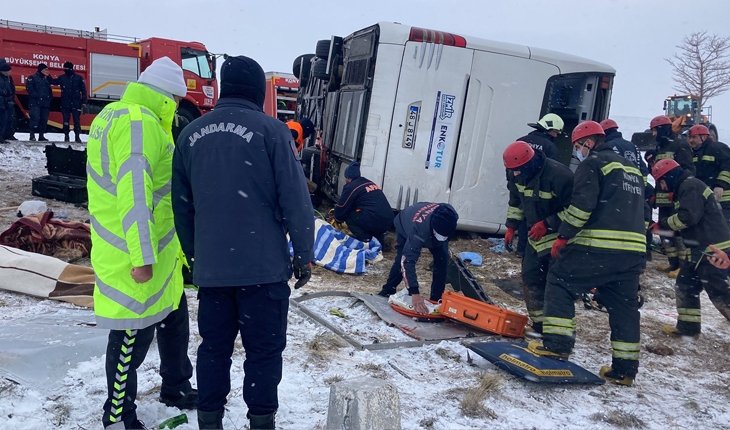 Konya’da bir tur otobüsünün buzlanma ve tipi nedeniyle şarampole devrilmesi sonucu 5 kişi hayatını kaybederken, 42 kişi de yaralandı.