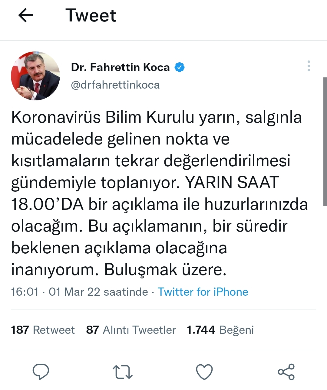 ”Koronavirüs Bilim Kurulu yarın, salgınla mücadelede gelinen nokta ve kısıtlamaların tekrar değerlendirilmesi gündemiyle toplanıyor. Yarın saat 18.00’da bir açıklama ile huzurlarınızda olacağım. Bu açıklamanın, bir süredir beklenen açıklama olacağına inanıyorum. Buluşmak üzere.”