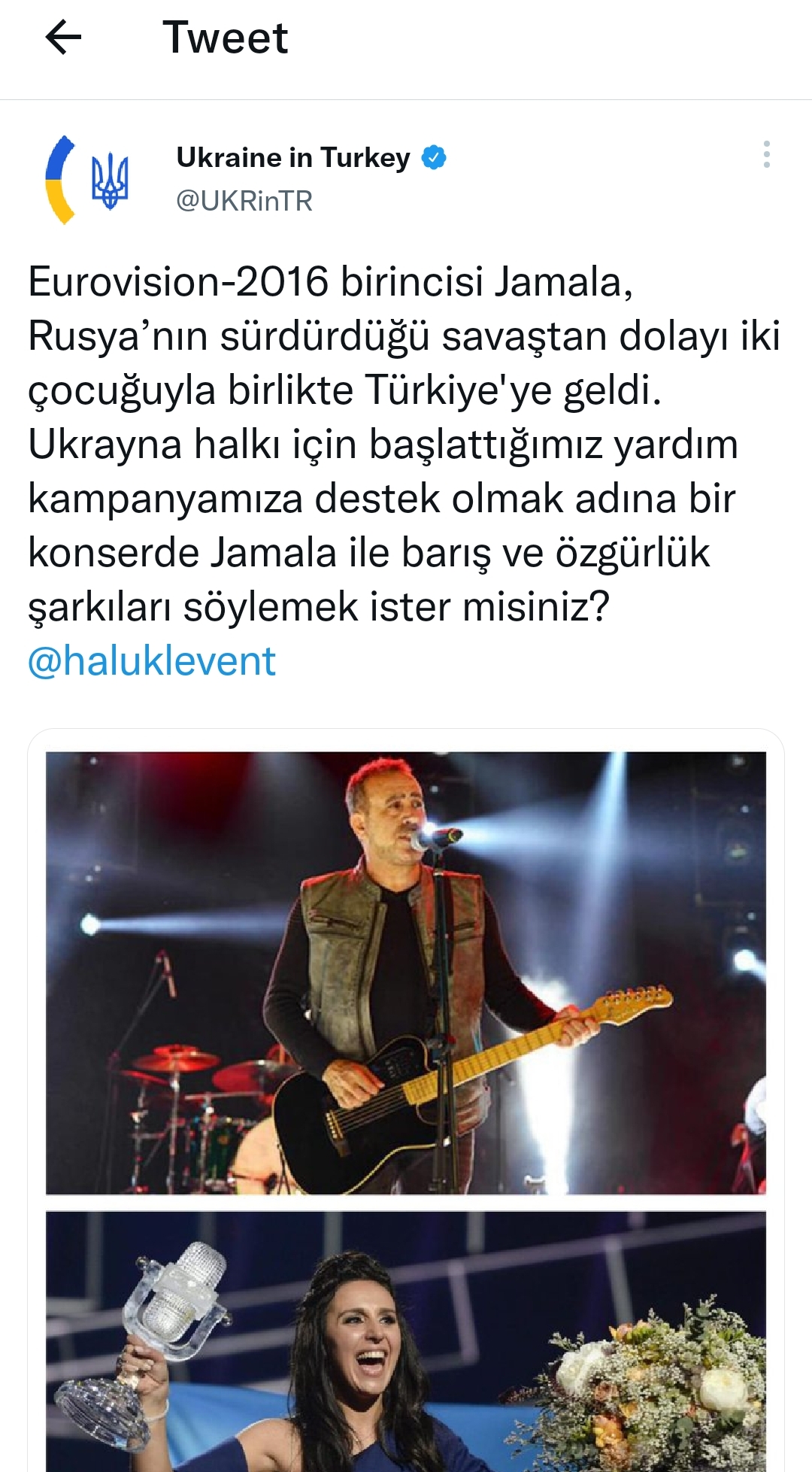 Büyükelçiliğin Twitter hesabından yapılan paylaşımda, “Eurovision 2016 birincisi Jamala, Rusya’nın sürdürdüğü savaştan dolayı iki çocuğuyla Türkiye’ye geldi. Ukrayna halkı için başlattığımız yardım kampanyamıza destek olmak adına bir konserde Jamala ile barış ve özgürlük şarkıları söylemek ister misiniz?” denildi.