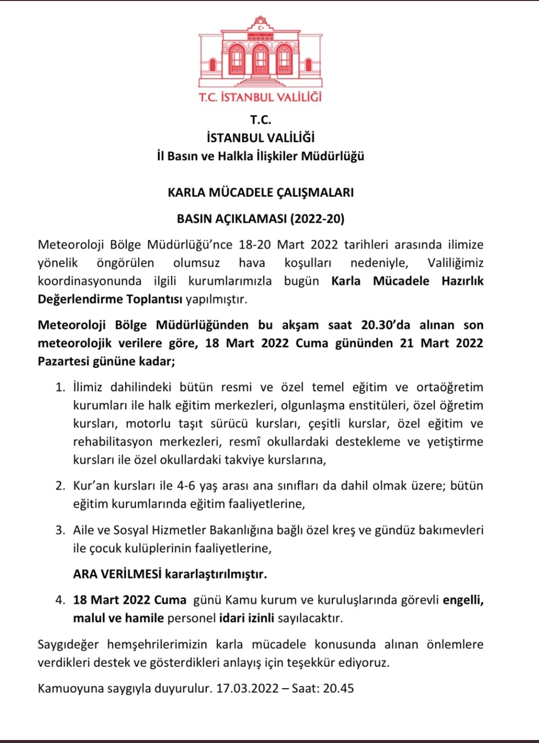 İstanbul’da okul ve kurslar 18-21 Mart arası tatil edildi.