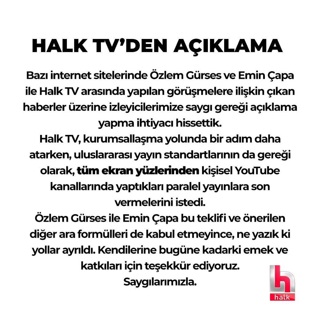 Halk TV’den yapılan açıklamada, “Halk TV kurumsallaşma yolunda bir adım daha atarken uluslararası yayın standartlarının da gereği olarak tüm ekran yüzlerinden kişisel youtube kanalların paralel yayınlarına son vermelerini istedi. Özlem Gürses ve Emin Çapa bu teklifi ve önerilen ara teklifleri kabul etmeyince ne yazık ki yollar ayrıldı” denildi.