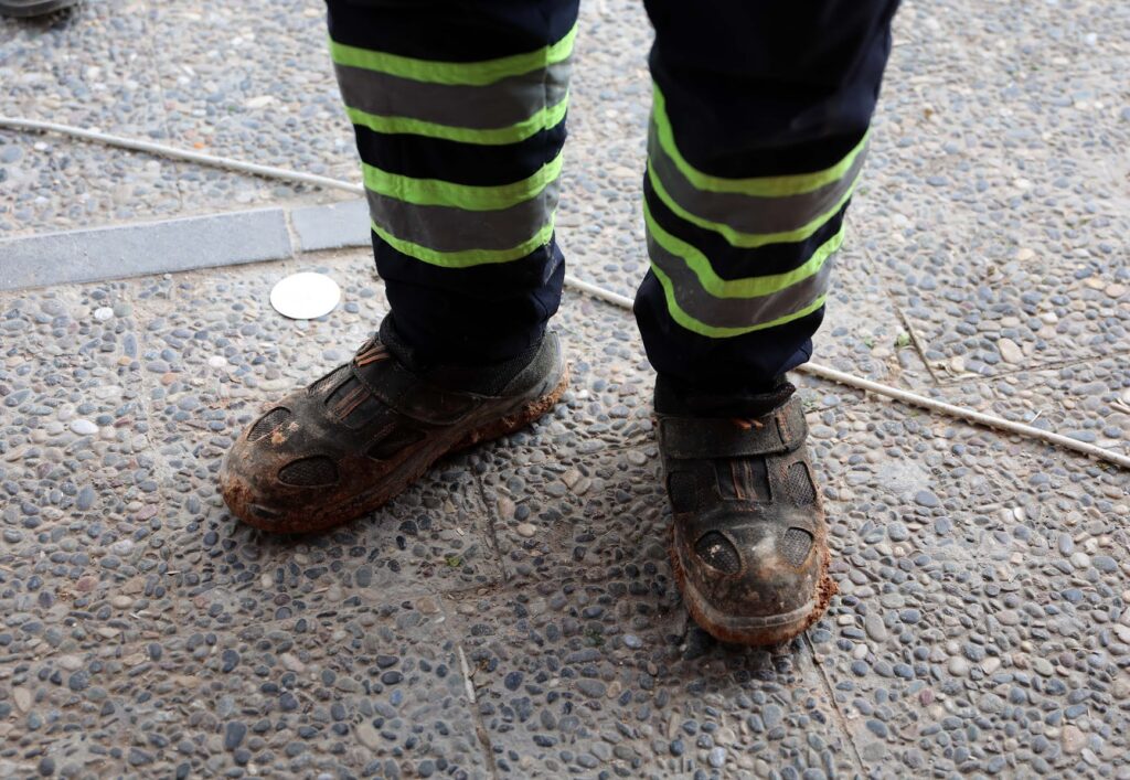 Belediye işçisi Ahmet Ataş, çalışmasına ara vererek gittiği markete girmeden önce çamurlu ayakkabılarını çıkarıp, alışveriş yaptı.