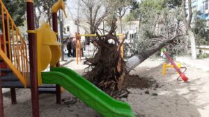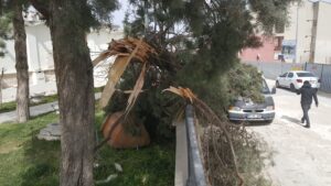 Şiddetli rüzgar nedeniyle Ulus Pazarı’nın girişinde bulunan çatıdan bir parça alışverişi yapan kadının başına düştü. Kadının yaralandığını gören vatandaşlar durumu polis ve ambulans ekiplerine bildirdi. Olay yerine gelen ambulans ekipleri, ilk müdahalenin ardından yaralı kadını hastaneye kaldırdı. Şiddetli rüzgar nedeniyle pazaryerinde ağaçlar da devrildi.