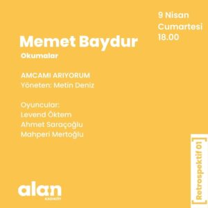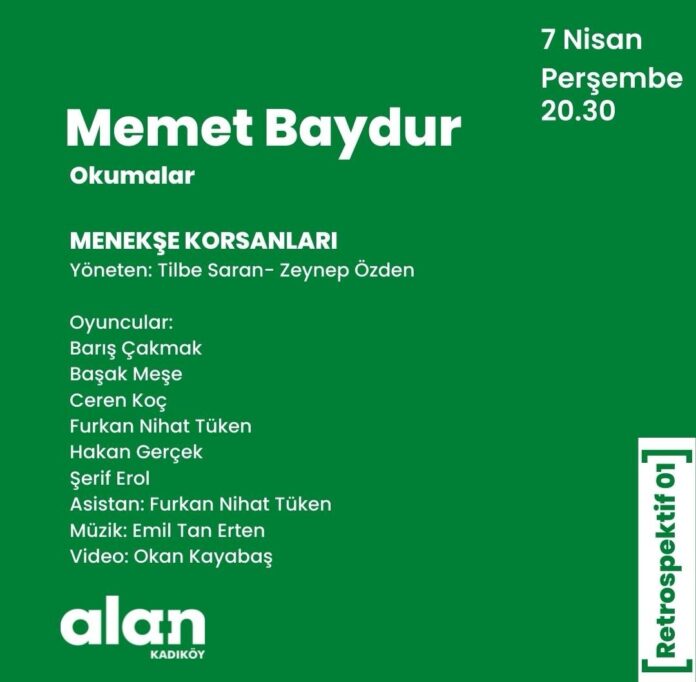 Alan Kadıköy Memet Baydur retrospektifi çerçevesinde yazarın üç oyunu, “Menekşe Korsanları”, “Kamyon”, “Yangın Yerinde Orkideler” ve bir öyküsünün “Amcamı Arıyorum” farklı kuşaklardan yönetmen ve oyuncular tarafından sahnede okunmasının yanı sıra Baydur tiyatrosundan hareketle günümüz tiyatrosu üzerine konuk konuşmacılar ile seyircilerin de oyuncular ve yönetmenlere katılmasıyla yapılacak oturumlar düzenlenecek. 7-10 Nisan tarihleri arasında dört gün boyunca Alan Kadıköy’de seyirciyle buluşacak etkinliğin biletleri mobilette satışta.