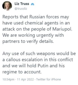 İngiltere Dışişleri Bakanı Liz Truss, departmanının iddiaları doğrulamak için yoğun bir şekilde çalıştığını söyledi. Mariupol’u savunan Azov Taburu’ndan yapılan açıklamada, insansız Rus hava araçlarının kent üzerinden geçmesi sonrası Ukrayna askerlerinin solunum sorunları yaşadığı duyurulmuştu.