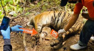 Başka bir dişi kaplanın cesedi, saatler sonra, yaklaşık 500 metre uzaklıkta, neredeyse kopmuş boynu ve bacaklarıyla bir tuzakla bulundu, .