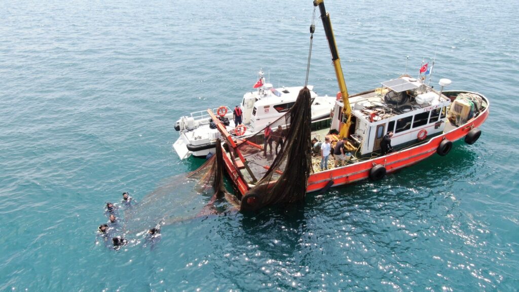 Türkiye’nin en büyük ‘hayalet’ ağı 30 metre derinlikten su yüzeyine çıkarıldı