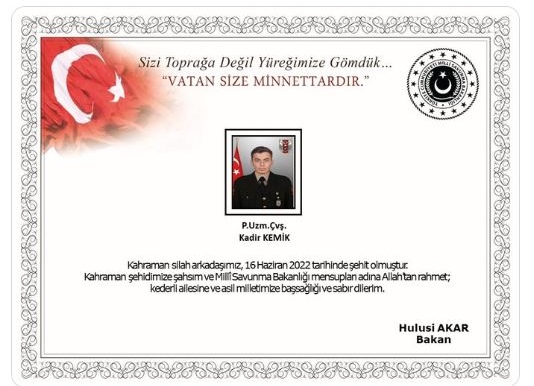 MSB: “Piyade Uzman Çavuş Kadir Kemik yapılan tüm müdahalelere rağmen kurtarılamayarak şehit olmuştur. Bizleri derin bir acı ve üzüntüye boğan bu olayda hayatını kaybeden aziz şehidimize Allah’tan rahmet, kederli ailesine, Türk Silahlı Kuvvetleri ile asil milletimize başsağlığı ve sabır dileriz.”