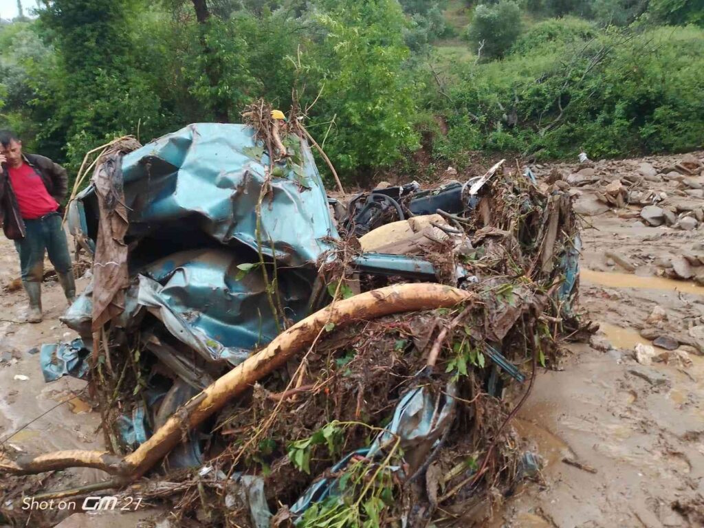 Aydın’ın Köşk ilçesinde akşam saatlerinde etkili olan ve yaklaşık 20 dakika süren sağanak yağış sonrasında adeta ortalık savaş alanına dönerken, sele kapılan bir otomobilden ise sadece metal yığını kaldı.