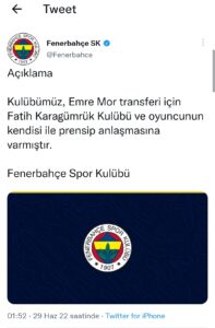 “Kulübümüz, Emre Mor transferi için Fatih Karagümrük Kulübü ve oyuncunun kendisi ile prensip anlaşmasına varmıştır.”