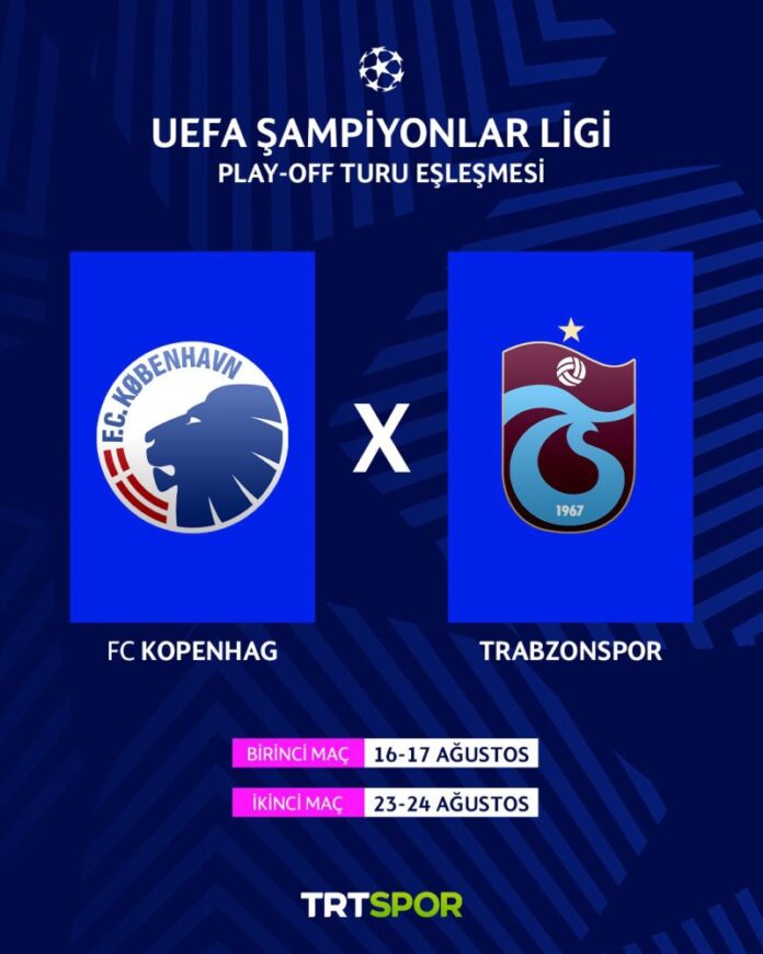 DünyaKentSon Haber !Spor Trabzonspor, UEFA Şampiyonlar Ligi play-off turunda Kopenhag ile eşleşti. By Kent Ekranı - 2 Ağustos 2022 0 Share Facebook Twitter Google+ Pinterest WhatsApp Trabzonspor, UEFA Şampiyonlar Ligi play-off turunda Kopenhag ile eşleşti. Trabzonspor’un Kopenhag ile oynayacağı play-off turunun ilk maçı 16-17 Ağustos’ta, ikinci maçı ise 23-24 Ağustos tarihlerinde oynanacak.