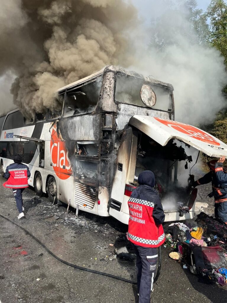 Sakarya’da TEM Otoyolu üzerinde seyir halinde olan Metro Turizm’e ait şehirler arası yolcu otobüsü alev alev yandı. Yangın sırasında otobüste bulunan 74 kişi canlarını son anda kurtardı.