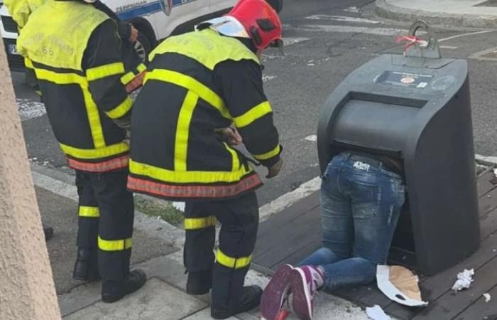 Fransa’nın Perpignan kentinde yirmili yaşlarında bir adam telefonunu almaya çalışırken bir çöp kutusuna sıkıştı.