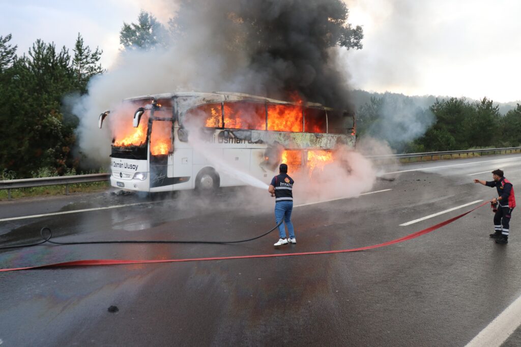 Bolu’da, TEM Otoyolu’nda seyir halindeyken motor bölümünden çıkan yangınla yolcu otobüsü alev topuna döndü.