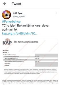 Sarı lacivertli kulüpten Kamuoyu Aydınlatma Platformu’na bildirilen yazıda İçişleri Bakanlığı’na karşı 3 Temmuz 2011 sürecine ilişkin maddi-manevi tazminat talepli davanın açıldığı belirtildi: