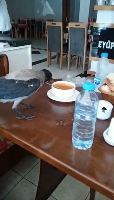 Karga, hem çorba hem de suyunu ‘elleriyle’ içti.