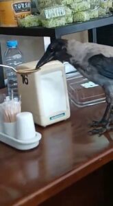 Karnını doyuran karga peçeteyle ağzını temizledikten sonra restoranı terk etti.
