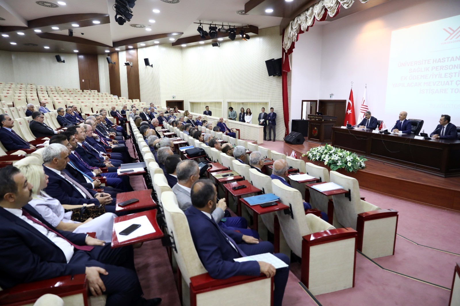 Üniversite hastanelerinde çalışan sağlık personeline yönelik ek ödeme/iyileştirme konusunda yapılacak mevzuat çalışmasına ilişkin Yükseköğretim Kurulu Başkanı Erol Özvar başkanlığında, bünyesinde tıp fakültesi bulunan 81 devlet üniversitesi rektörünün katılımıyla bir toplantı gerçekleştirildi.