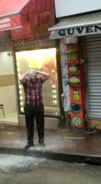 Sağanak yağan yağmurun altına giren vatandaş şampuanla yağmurun altında kafasını yıkadı. Renkli görüntülerin oluştuğu anlar arkadaşlarının cep telefonu kameralarıyla kaydedildi.