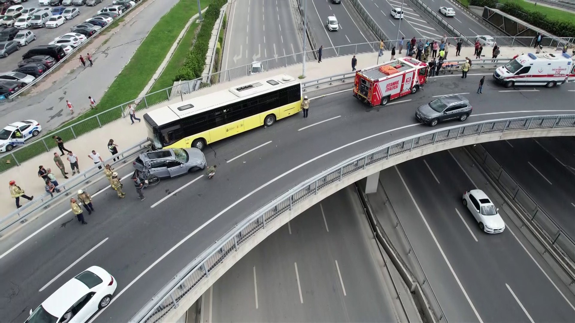Otobüs önündeki araçlara çarpa çarpa ilerledi. Bir motosikleti de altına alan otobüs, bariyerlere çarparak durdu.
