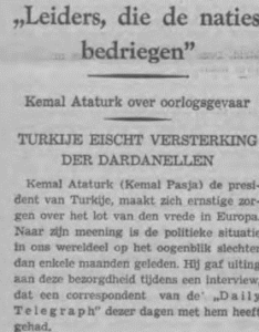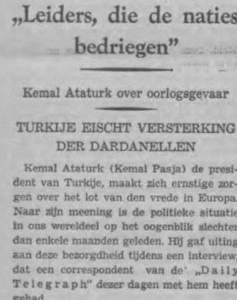 De Volkskrant, Atatürk’ün diğer Avrupalı liderlere yönelik eleştirilerini ve yakın gelecekte ortaya çıkan yeni bir savaş tehdidini bile yayınlamıştır. 1935 yılında gerçeklesen bu röportaj, İngiliz basın kurulu Daily Telegraph ile yapılmıştır ve Atatürk’ün bu sözleri, bir kehanet gibi tecelli etmiştir zira yalnızca 4 yıl sonra, İkinci Dünya Savaşı patlak vermiştir.