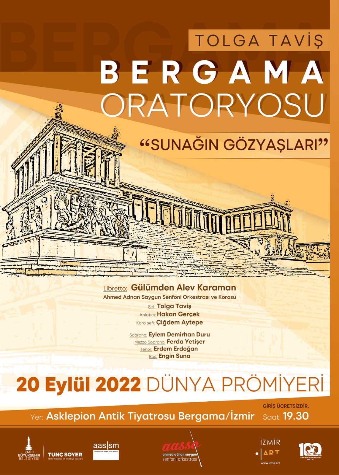 Zeus Sunağı’nın Bergama’ya getirilmesi için dünya kamuoyunu harekete geçirme amacıyla bestelenen Bergama Oratoryosu “Sunağın Gözyaşları” Bergama Asklepion Antik Tiyatro’da sunulacak.