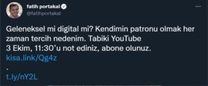 TV’ üzerinden içerik üreteceğini söyleyen Portakal, “3 Ekim Pazartesi’den itibaren 11:30’da hafta içi her gün ‘Sözün Özüyle’ sizlerin karşısında olacağım. Türkiye’yi ve dünyayı sizlerle anlamaya ve anlamlandırmaya çalışacağım. Daha özgür bir ortamda paylaşımlar yapacağız. Aynı zamanda benden başka insanlar da olacak ve içerik üretecekler” ifadelerini kullandı.