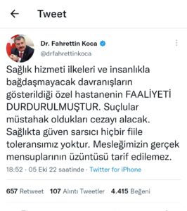 “Sağlık hizmeti ilkeleri ve insanlıkla bağdaşmayacak davranışların gösterildiği özel hastanenin faaliyeti durdurulmuştur. Suçlular müstahak oldukları cezayı alacak. Sağlıkta güven sarsıcı hiçbir fiile toleransımız yoktur. Mesleğimizin gerçek mensuplarının üzüntüsü tarif edilemez.”
