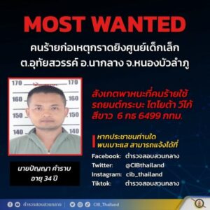 Yerel medyada yer alan haberlerde saldırgan için bir uyarı ilanı yayınlanırken, “En son Bangkok’da 6499 plakalı beyaz bir araçta görüldü. Silahlı ve çok tehlikeli olduğu düşünülüyor” denildi. Vatandaşlardan gerekli durumlarda ihbar etmeleri istendi.