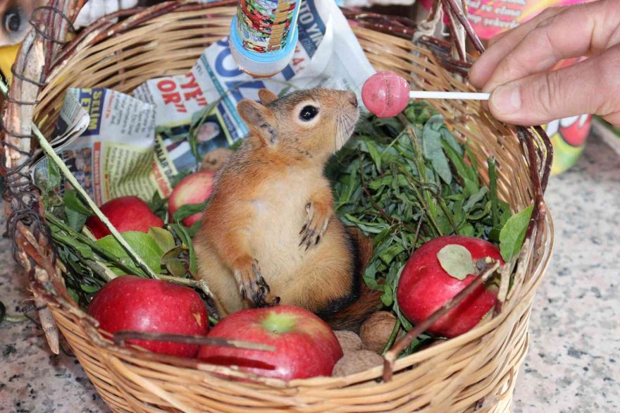 “Bakkaldan süt aldım şırınga ile ufak, ufak beslemeye başladım. Daha sonra çekirdek yemeye, çay içmeye başladı. Geliştikçe domates salatalık gibi meyve sebze yemeye başladı. Alıştıkça üzerimden inmemeye başladı. İş yerime giderken fırından ekmek alıp iş yerimizi beraber açıyoruz beraber çalışıyoruz. İş yerimize gelen çocuklar, aileler sincabı sevmeden gitmezler. Benim de hoşuma gidiyor çocuklara hayvan sevgisini öğretmeye çalışıyorum. Artık büyüdü özgür ve serbest gidebilir, ben onu tekrar doğaya bırakmak istesem de o beni bırakmıyor.”