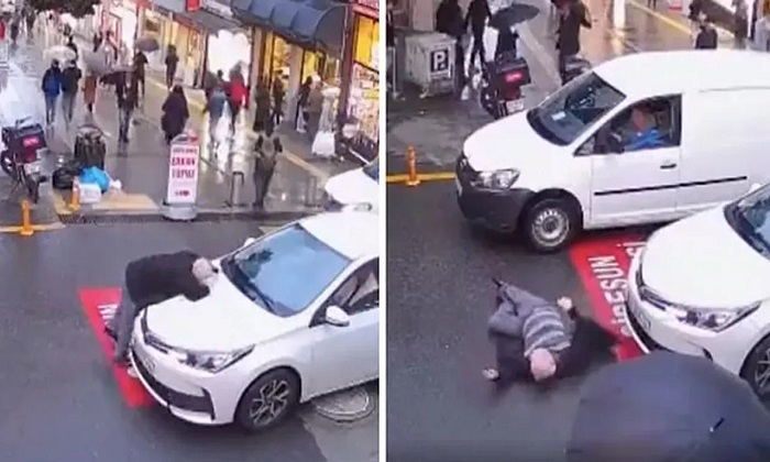 Saat 17.00 sıralarında meydana gelen olayda yayanın arabanın üzerine yatış ve yere düşüş anları, caddedeki kamera tarafından anbean kaydedildi.