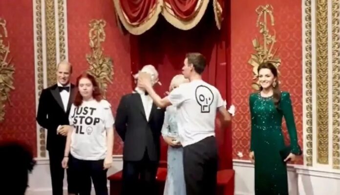 İngiltere’de Just Stop Oil (Sadece Petrolü Durdurun) adlı gruba bağlı aktivistler, Kral Charles’ın balmumu heykeline çikolatalı pasta yapıştırarak protesto gerçekleştirdi.