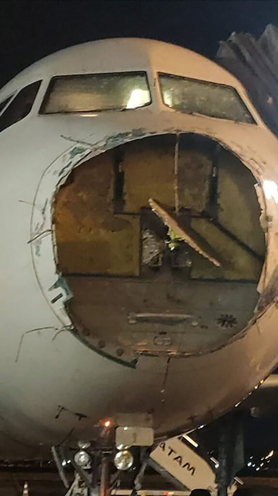 Havadaki panik anları amatör kameraya yansırken, uçağın burnu ile ön camının parçalandığı görüldü.