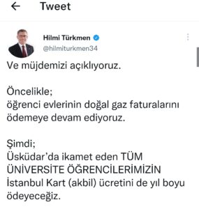 Binlerce üniversite öğrencisini ilgilendiren müjdeyi Üsküdar Belediye Başkanı Hilmi Türkmen sosyal medya üzerinden duyurdu. Hilmi Türkmen mesajında “Ve müjdemizi açıklıyoruz. Öncelikle; öğrenci evlerinin doğal gaz faturalarını ödemeye devam ediyoruz. Şimdi; Üsküdar’da ikamet eden tüm üniversite öğrencilerimizin İstanbul Kart (Akbil) ücretini de yıl boyu ödeyeceğiz. Sizi çok seviyoruz!” dedi.
