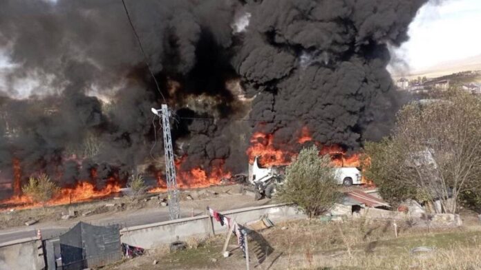 Tutak ilçesinde tanker, yolcu otobüsü ve kamyonun karıştığı zincirleme kazada araçlar alev alev yandı.