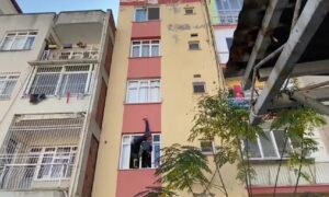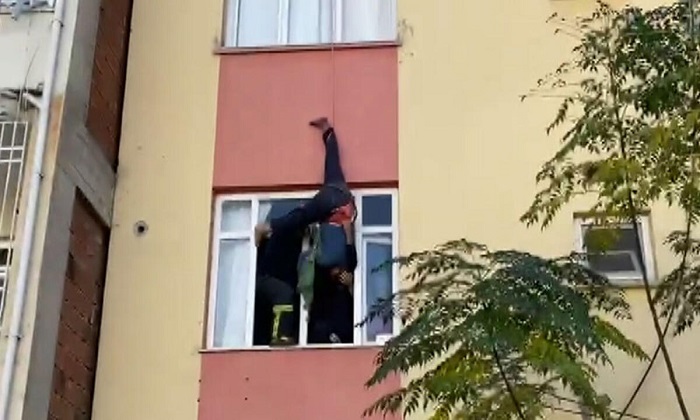 Halatın bir ucunu sabit bir yere, diğer ucunu da bacağına bağlayan İbrahim Çelikdemir, aşağı sarktı. Dairesinin penceresine kadar inen Çelikdemir, tutunarak indiği halat kısa kaldı. Çelikdemir, bir süre sonra yorulup elini bırakınca, bacağından halatta asılı kaldı.