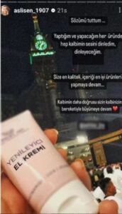 “Allah her isteyene nasip etsin inşallah. İnsanın gönlüne buranın sevdası düşünce, ne iş dinliyor ne başka bir şey. Hem dualarımdan eksik olmayan ve Allah’a emanet ettiklerim var. Onlara bol bol dua ettim, arayabildiklerimi aradım. Bir de Allah’a havale ettiklerim var tabii” diyerek yaptığı paylaşımla dikkat çeken Aslı Şen daha sonra ise fona Kabe’yi alarak markasının reklamını yaptı.