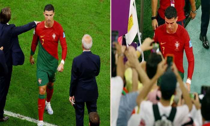 Cristiano Ronaldo (left of picture) walks straight off while his teammates celebrate with fans. #FIFAWorldCup pic.twitter.com/W7jB6iGQOO